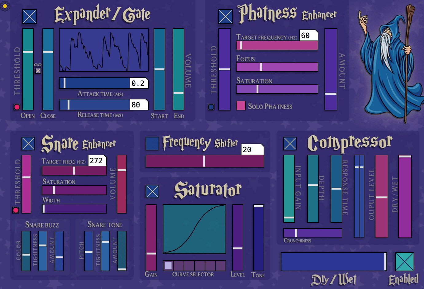 Backed by nearly 8000 years of sacred knowledge and divine magic, the Dark Mage of Percussive Glory, commonly referred to as the Drum Wizard, has arrived to share the secrets once safeguarded by countless generations of alchemists and sorcerers alike. This mystical force has manifested itself in the ultimate all-in-one drum processor and multi-effect, DrumWizard, sharing the namesake of its immortal creator.